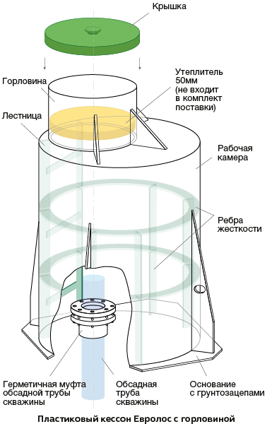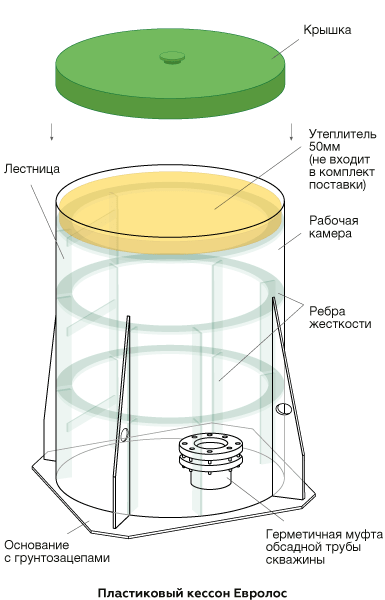 Кессон – это углубленная в грунт ёмкость, защищающая скважину и трубы от промерзания, а также проникновения сточных и высоких грунтовых и паводковых вод. Традиционно, кессоны изготавливались из стали. Сегодня им на смену пришли пластиковые конструкции из монолитного полипропилена.