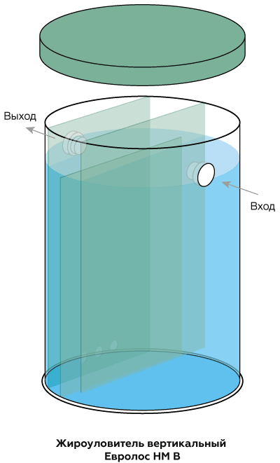По конструкции цеховой вертикальный жироуловитель аналогичен трехкамерному септику и состоит из цилиндрического корпуса, внутри которого особым образом размещены перегородки, а также горловиной и крышкой в верхней части.