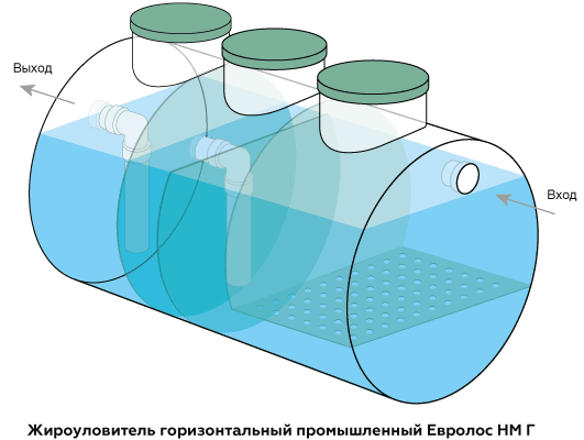Жироуловители Евролос НМ Г имеют ту же конструкцию, что и трехкамерные септики. Сварной корпус из листового полипропилена внутри делится на отсеки с помощью перегородок. Сточные воды самотеком последовательно проходят через камеры. Перегородки задерживают сток, в результате снижается скорость его течения. Взвесь начинает расслаиваться, жир и масла всплывают на поверхность, твердые частицы опускаются на дно.