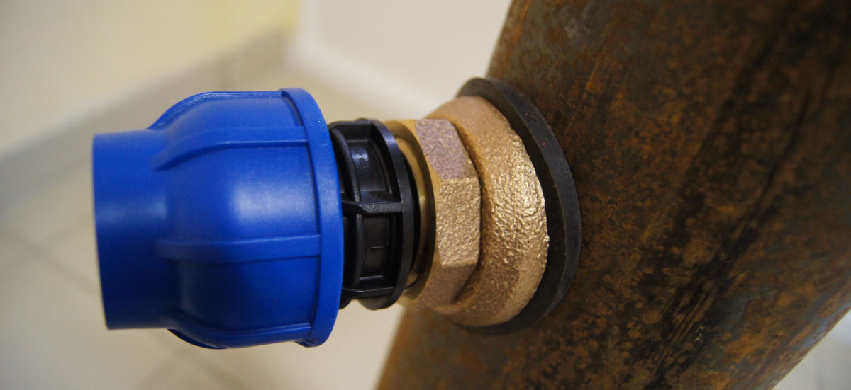 5. Далее к резьбовому отводу при помощи металлического компрессионного фитинга подключается горизонтальная труба в дом.