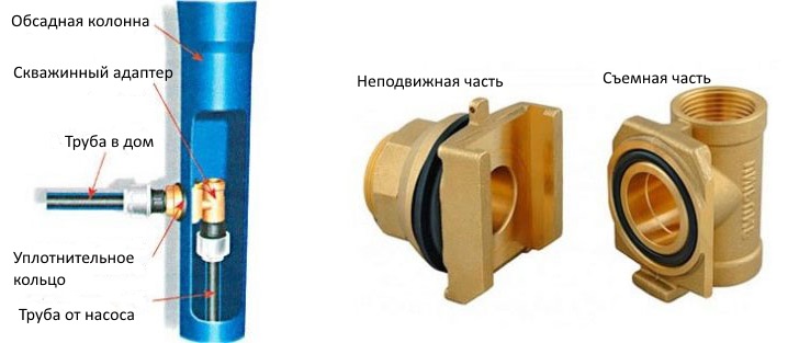 Конструкционно адаптер является герметичным разъемным соединением типа «ласточкин хвост» и состоит из трех основных частей. Съемная часть (клин) посредством компрессионного фитинга крепится на вертикальной трубе с насосом, а неподвижная часть (держатель) с направляющими для клина и резьбовым отводом при помощи радиусной шайбы и зажимной гайки крепится сквозь стенку обсадной трубы.